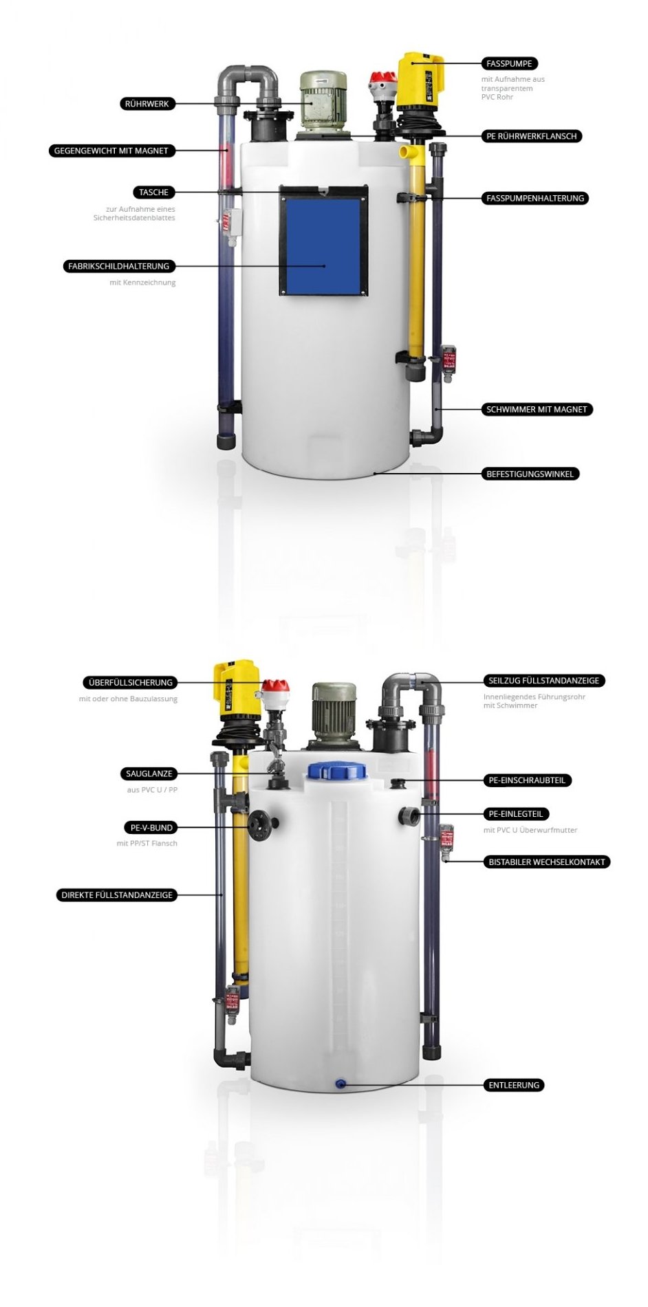 Diese Dosierbehälter mit Rührwerk können sowohl auf handelsübliche Dosierbehälter 35 -1000 Liter und auch auf handelsübliche Lagerbehälter aufgebaut werden. In Abhängigkeit vom Medium, Viskosität, der Temperatur und der Konzentration legt der Rührwerkshersteller das Rührwerk aus. Die aufgeschweißte PE Montagplatte mit Lochkreisbild des Rührwerks und der bei Bedarf erforderliche Schutzschwingflansch, stellen einen störungsfreien Betrieb im Einsatzfall dar. Die Befestigungswinkel am Dosierbehälter mit Rührwerk, verhindern das Wandern des Dosierbehälters im Betrieb. Zusätzlich zum Rührwerk, können wir Ihnen bei Bedarf und in Abhängigkeit vom Prozess, auch diverse Ablaufkugelhähne, Einlaufstutzen und Füllstandsanzeigen, bzw. Füllstandkontrolleinheiten anbauen.