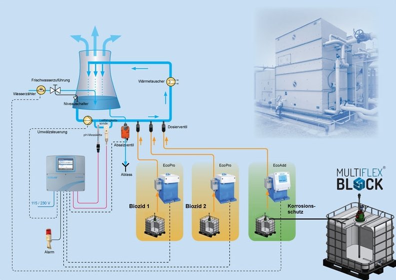 Biozide bekämpfen Mikroorganismen, wie schleimbildende Bakterien, Legionellen sowie Algen und Pilze.  In Kooperation empfehlen wir zur Biozid Dosierung ECOLAB Dosiertechnik EcoPro und EcoAdd  sowie ECOLAB Mess- und Regeltechnik in Form des Versatronics.