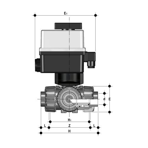 | 3/2-Wege-Kugelhahn aus ABS mit elektrischem Stellantrieb mit Endlagenrückmeldern, Handnotbetätigung und optischer Stellungsanzeige Kugel mit L-Bohrung Standardkugelstellung: 1 Stellantriebsdaten: Standard 90-240V / 50-60Hz (AC) ohne Aufpreis 24V AC/DC Andere Spannungen auf Anfrage ***DN50 = PN16 auf Anfrage Anschluss: Klebemuffe Dichtung: PTFE/EPDM |