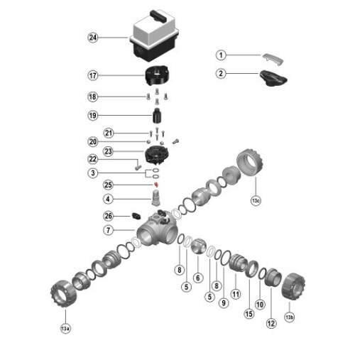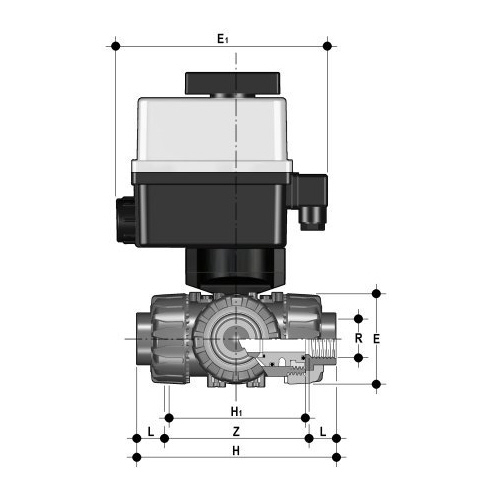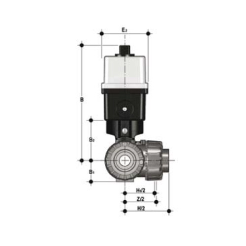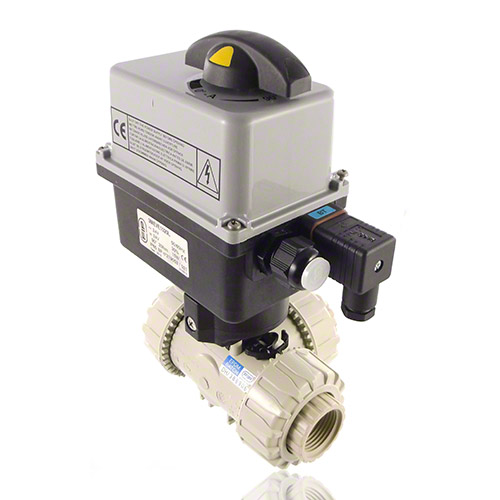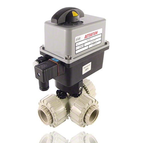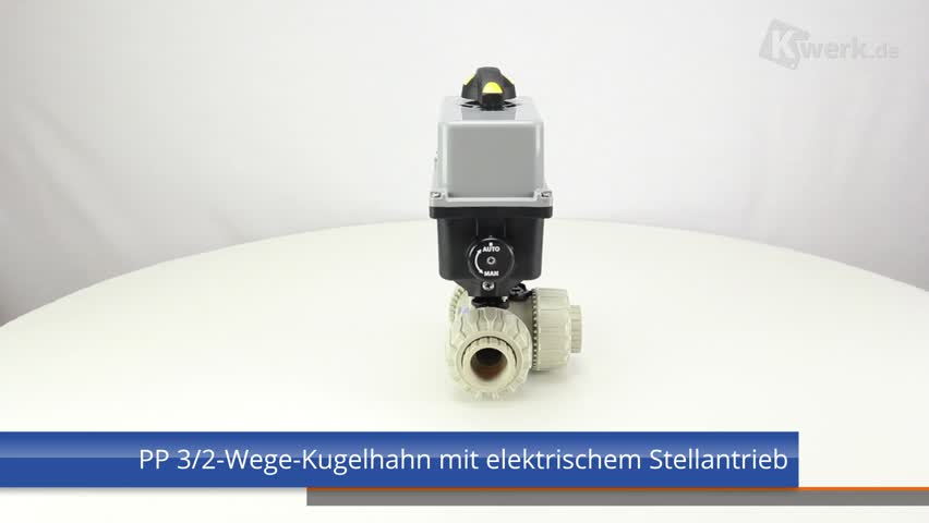| 3/2-Wege-Kugelhahn aus PP mit elektrischem Stellantrieb mit Endlagenrückmeldern, Handnotbetätigung und optischer Stellungsanzeige Kugel mit L-Bohrung Standardkugelstellung: 1 Stellantriebsdaten: Standard 90-240V / 50-60Hz (AC) ohne Aufpreis 24V AC/DC Andere Spannungen auf Anfrage Anschluss: Gewindemuffe Dichtung: PTFE/FPM |