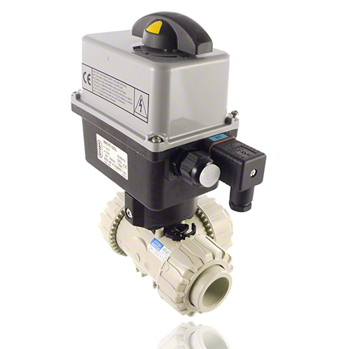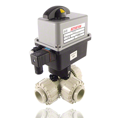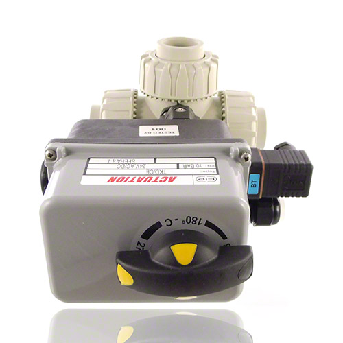 | 3-Wege-Kugelhahn aus PP mit elektrischem Stellantrieb mit Endlagenrückmeldern, Handnotbetätigung und optischer Stellungsanzeige Kugel mit T-Bohrung Standardkugelstellung: 1 Stellantriebsdaten: Standard 90-240V / 50-60Hz (AC) ohne Aufpreis 24V AC/DC Andere Spannungen auf Anfrage Anschluss: Schweißmuffe zum Heizelementmuffenschweißen Dichtung: PTFE/EPDM |