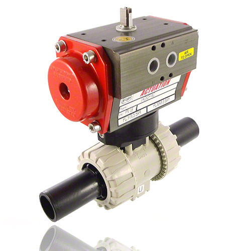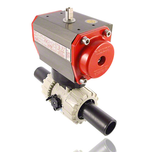 2/2-Wege-Kugelhahn mit gesicherten Überwurfmuttern aus PP mit pneumatischem Stellantrieb