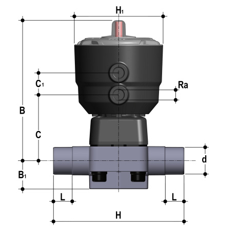 | 2/2-Wege-Membranventil mit pneumatischem Kolben-Stellantrieb mit optischer Stellungsanzeige maximierter Durchfluss Gehäusewerkstoff: PVC-C Funktion: normal geöffnet (NO) Membranwerkstoff: FKM Steuerdruck: max. 6 bar Steueranschluss (Ra): G 1/4' Antriebsfarbe: schwarz (mit grauer Haube) Steueranschluss in Durchflussrichtung Betriebsdruck: einseitig anstehend Anschluss: Klebestutzen |
