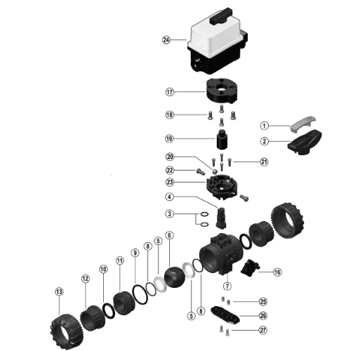 Unsere elektrischen Kugelhähne aus PVC-C, PVC-U, ABS, PP und PVDF erfreuen sich großer Beliebtheit in der Verfahrenstechnik. Der robuste VKD Kugelhahn mit festellbaren Überwurfmuttern bietet eine zuverlässige Lösung für industrielle Anwendungen. Je nach Anlagen- und Infrastrukturanforderungen kann der Kugelhahn sowohl in elektrischer als auch pneumatischer Ausführung geliefert werden. Ihre Vorteile und unser Leistungsversprechen:- Größen von DN 10 mm bis DN 50 mm erhältlich - Maximaler Betriebsdruck von 16 bar bei 20°C - Die neue Sperrvorrichtung gewährleistet eine sichere Positionierung der Überwurfmuttern unter verschiedenen Einsatzbedingungen wie Vibrationen oder thermischer Ausdehnung. - Einfacher Ausbau der Armatur aus dem Rohrleitungssystem ermöglicht schnellen Wechsel von O-Ringen oder Kugelsitzen ohne zusätzliches Werkzeug. - Die Kugelabdichtung ist dank Mikro-Justierung in geschlossener Stellung des Kugelhahns frei von Rohrleitungskräften, was ein leckagefreies Lösen der drucklosen Seite der Leitung ermöglicht. - Handbetätigung und optische Stellungsanzeige serienmäßig verfügbar. - Zusätzlich sind 2 Endschalter integriert. Anschlussmöglichkeiten:Unsere Kugelhahnreihe erfüllt die Normen für folgende Anschlussvarianten: - Klebeanschluss PVC-U: EN ISO 1452, EN ISO 15493, ISO 727, DIN 8062, DIN 8063, ASTM D2467, BS -1, ISO 727-2, JIS K 6743, JIS 6741-2 - Klebeanschluss PVC-C: EN ISO 15493, ISO 727-1, ASTM F439 - Schweißanschluss PP-H: EN ISO 15494 - Schweißanschluss PVDF: EN ISO 10931 - Gewindeverbindung: ISO 228-1, DIN 2999, ISO 7-1, ASTM D2467, ASTM F437, BS 21, BS 10226, JIS B 0203 - Flanschanschluss: ISO 2084, EN ISO 1092-1, EN ISO 1452, EN ISO 15493, EN 558, ISO Elektro-Antrieb mit Kunststoffgehäuse:-Temperaturbereich: -10°C bis +55°C Elektroanschluss:- Standard: 90-240V / 50-60Hz (AC), optional 24V AC/DC ohne Aufpreis - Gerätestecker: DIN 43650 3P+T - Endschalter: Verschraubung ISO M20 Standardausführung:- Handhilfsbetätigung - Optische Stellungsanzeige - 2 zusätzliche FC1, FC2 Endschalter (5A) - Drehmomentbegrenzung Zubehör:- Stellungsregler 4-20 mA oder 0-10V - Sicherheitsblock - Heizwiderstand - Potentiometer (100-1000-5000-10000 Ohm) - Stellungsruckmelder - 2 zusätzliche Endschalter - IP67 oder ATEX Ex Bitte beachten Sie, dass alle oben genannten Informationen sorgfältig und nach bestem Wissen erstellt wurden. Dennoch können daraus keine verbindlichen Zusagen abgeleitet werden. Weitere Informationen finden Sie im Aufklapp-Menü rechts neben dem Artikel oder kontaktieren Sie uns einfach telefonisch. |