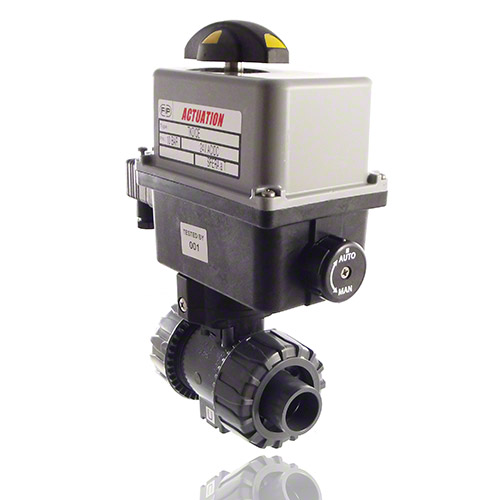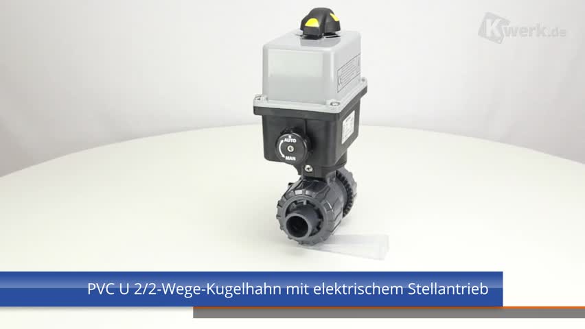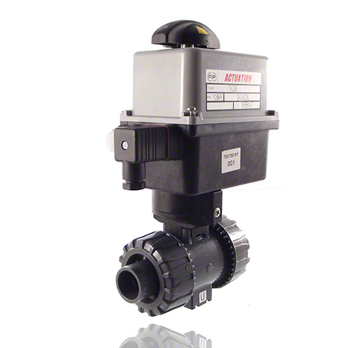 2/2-Wege-Kugelhahn mit gesicherten Überwurfmuttern aus PVC-U mit elektrischem Stellantrieb
