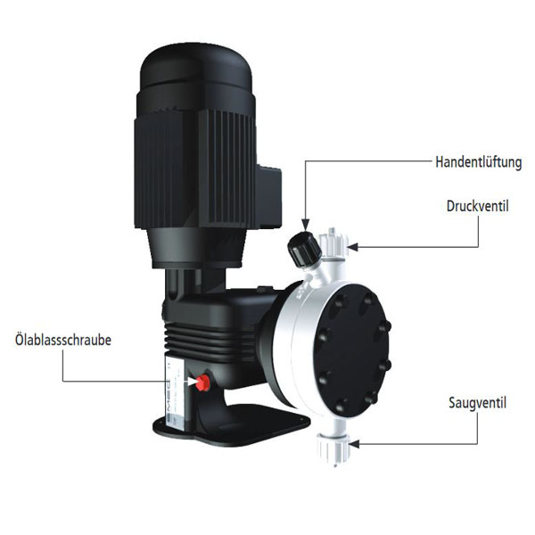 alternierende Hubbewegung erzeugt. Die Schubstange verformt eine flexible Membrane, die in dem sog. Dosierkopf eingebaut ist. Der Vorwärtshub erfolgt durch die Schubstange, der Rückwärtshub wird durch eine Feder bewerkstelligt. Die Hubfrequenz ist konstant und wird durch die Drehzahl des