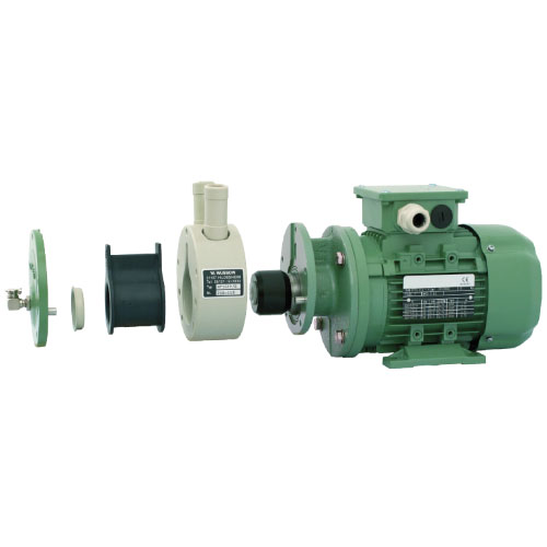WerkstoffeDas Fördermedium kommt nur mit der Außenfläche des Pumpenbalges und dem Gehäuse in Berührung. Gehäuse und Pumpenbalg sind aus verschiedenen korrosionsfesten Materialien in beliebigen Kombinationen lieferbar: Pumpengehäuse: Polyethylen (max. 80 °C) Polypropylen (max. 90 °C) PVDF (max. 120 °C) Pumpenbalg: EPDM (max. 100 °C) HYPALON (max. 100 °C) Viton (max. 120 °C) Buna (max. 80 °C) Pumpenflansch und Deckplatte sind aus widerstandsfähigem Stahlguss gefertigt. Durch die geschlossene Bauweise sind Welle und Lager auch gegen aggressive Einflüsse von außen bestens geschützt. AufbauDie Darstellung zeigt den einfachen Aufbau der WUFLEX-Pumpe, bestehend aus: Deckplatte, Expansionsring, Pumpenbalg, Gehäuse, Flansch und Motor. mDie WUFLEX-Pumpe NF70 besteht aus zwei Pumpen NF35, montiert an einem Motor (0,55 kW). Saug- und Druckstutzen sind jeweils zu einem Anschluss zusammengefasst. Die Exzenter der Pumpen arbeiten um 180º zueinander versetzt. Dadurch bildet. Montage und WartungWUFLEX-Pumpen erreichen in beiden Drehrichtungen die volle Förderleistung. Der Pumpenkopf lässt sich zu 0°, 90°, 180° und 270° auf dem Motor montieren (siehe Abbildung). Die Wartung beschränkt sich im Wesentlichen auf das gelegentliche Schmieren der Innenseite des Pumpenbalges. Der Pumpenbalg unterliegt einem natürlichen Verschleiß und muss, je nach chemischer und mechanischer Beanspruchung, nach einer gewissen Betriebszeit ausgewechselt werden. Dies kann ohne Spezialwerkzeuge in wenigen Minuten erfolgen. Die Pumpenbälge gibt es in zwei Größen, passend für die Größe 5 - 18 und für die Größe 35. Da auch andere Teile jeweils für mehrere Pumpengrößen passen, beschränkt sich die Ersatzteilbevorratung nur auf wenige Teile. ![]() |