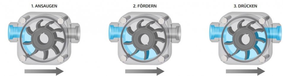 Das Impellerrad dreht sich im exzentrisch ausgeformten Gehäuse, sodass durch die Biegung der einzelnen Flügel ein Unterdruck entsteht und Flüssigkeit in das Vakuum gesaugt wird. Dabei dient das Medium selbst als Schmierung des Laufrads im Gehäuse. Um mögliche Schäden an der Pumpe zu vermeiden, kann jede ZUWA Impellerpumpe mit einem elektronischen Trockenlaufschutz ausgerüstet werden.
