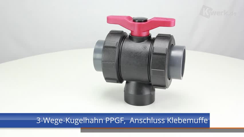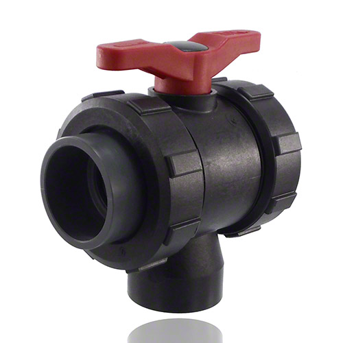 3-Wege-Kugelhahn PPGF, PVC-U-Klebemuffen, EPDM = roter Hebel