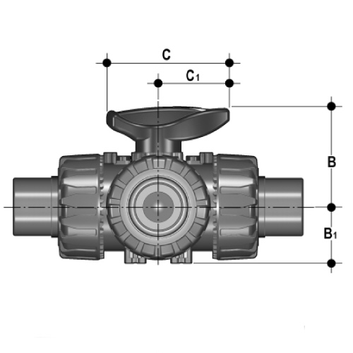 | - Bohrung: T-Bohrung - Anschluss: Schweißstutzen zum Muffenschweißen - radial ein- und ausbaubar - mit gesicherter Überwurfmutter - Dichtung: PTFE/FPM |