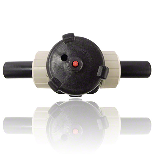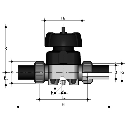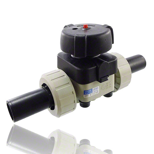 | - Anschluss: mit PE100-LS-Stutzen, SDR 11 zum Heizelementstumpf- und Heizwendelschweißen - Membrane: FPM - Dichtung in Verschraubung: FPM - mit schwarzem Handrad |