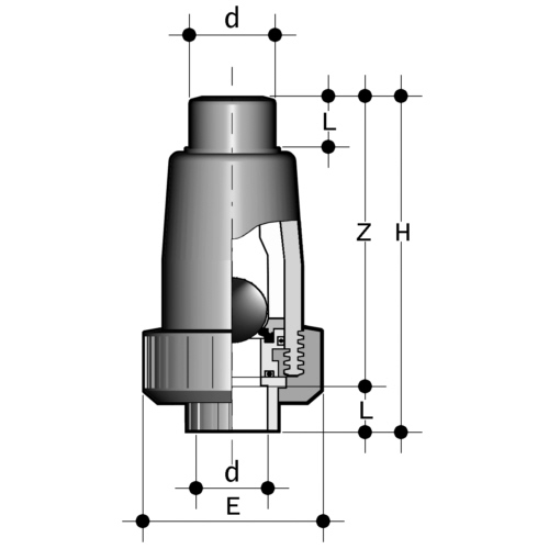 | Anschluss: zum Muffenschweißen Dichtung: EPDM Durchfluss nur in einer Richtung möglich Mindestdruck für tropfdichten Abschluss 0,4 bar bei waagrechter Stellung Nur einsetzbar bei Flüssigkeiten mit einer Dichte > 1,2 g/cm3 |