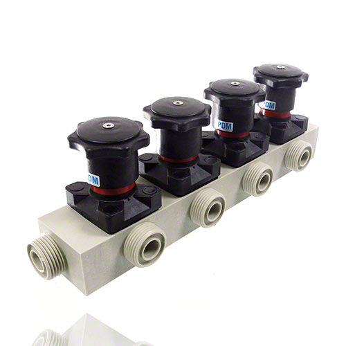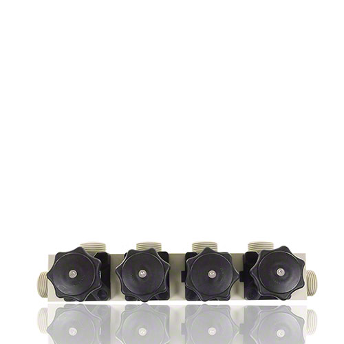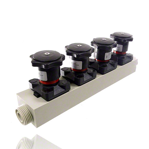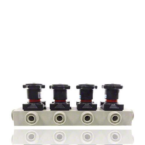 Mehrwegeventil aus PP mit vier Handantrieben, Abgang reduziert, Membrane FPM