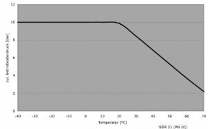 Die Kurve basiert auf einer Umgebungstemperatur von +20°C und Wasser als Medium. Die im Diagramm angegebenen Drücke gelten für eine Lebensdauer von 50 Jahren mit einem eingerechnetem Sicherheitsfaktor von 2,1. Das Druck-Temperaturdiagramm gilt nicht für die Abmessung 315 mm (belastbar bei 20° C mit 8 bar).